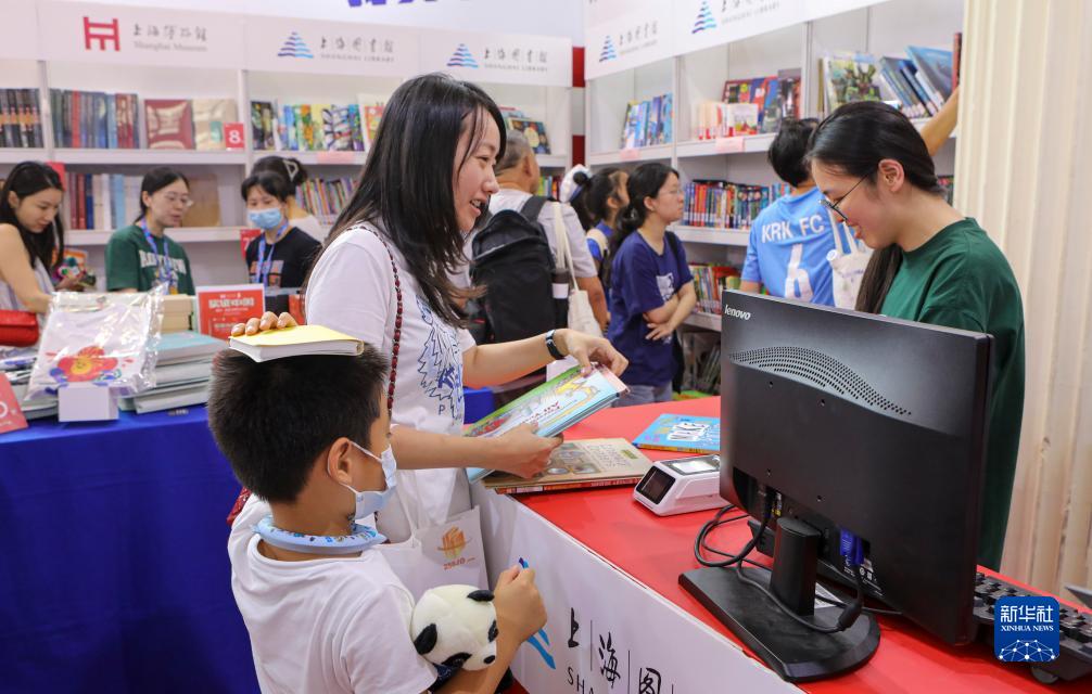 8月16日,讀者在上海圖書(shū)館展位現場(chǎng)借閱書(shū)籍。