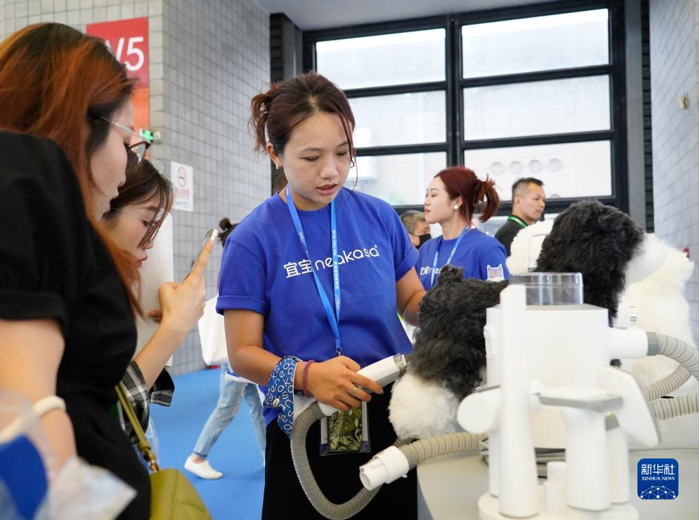 8月16日,在第25屆亞洲寵物展覽會(huì )上,參展商工作人員向觀(guān)眾演示寵物理毛器產(chǎn)品。
