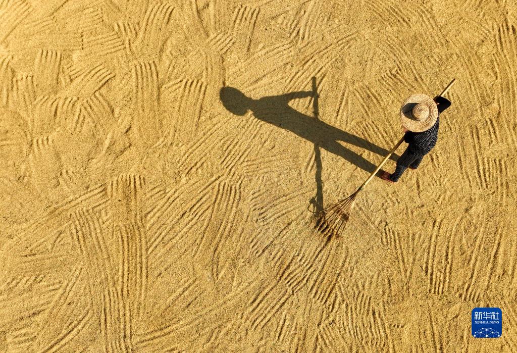 四川省廣安市華鎣市華龍街道東方村的農民晾曬從田間收獲的稻谷(無(wú)人機照片,8月15日攝)。