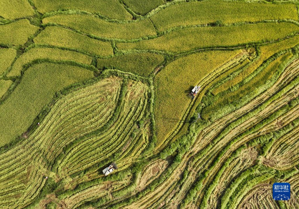 近日,四川東部廣安市近200萬(wàn)畝水稻進(jìn)入成熟收獲期,農民在田間忙碌,收獲水稻。