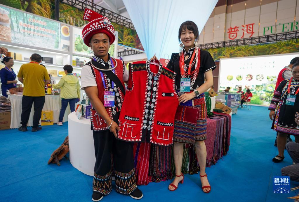 8月16日,來(lái)自云南西盟縣的參展商在第七屆中國—南亞博覽會(huì )上展示佤族傳統服裝?! ⌒氯A社記者 陳欣波 攝