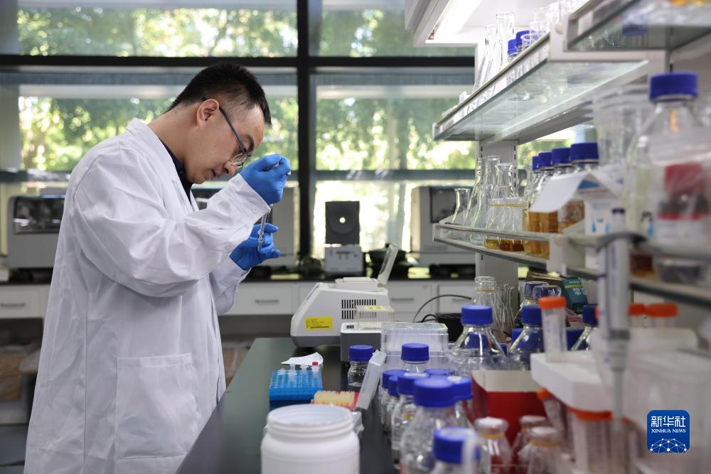 在中國科學(xué)院天津工業(yè)生物技術(shù)研究所實(shí)驗室,楊建剛副研究員在做人工合成己糖實(shí)驗(8月13日攝)。