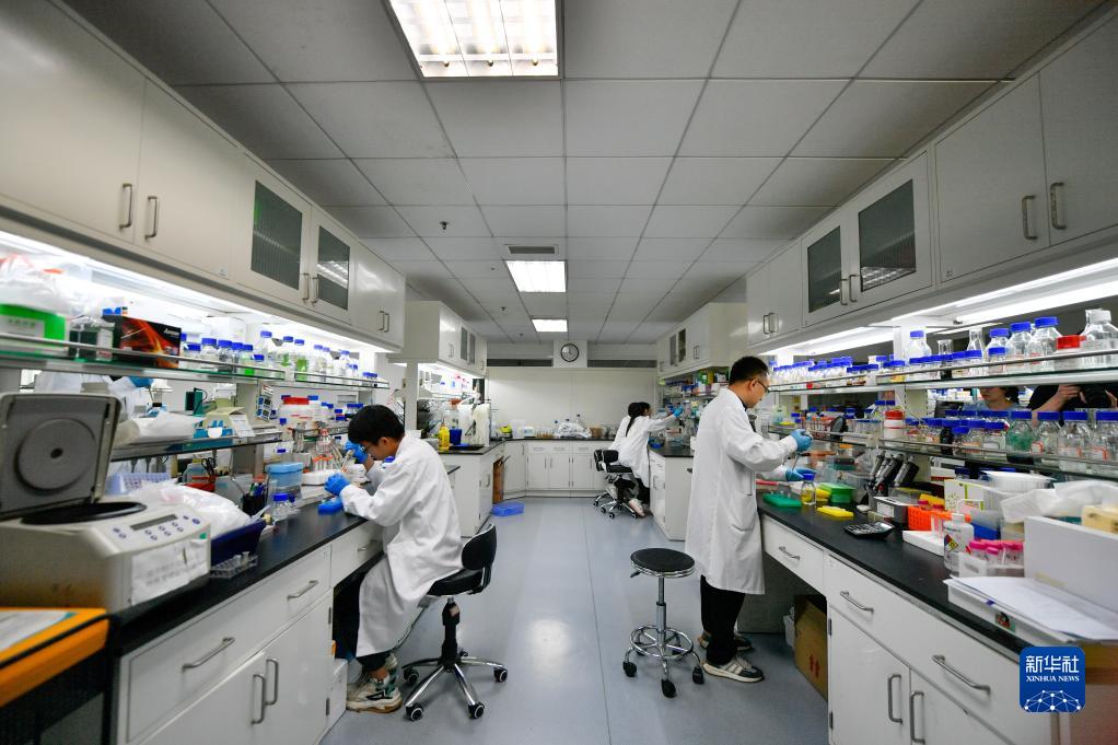在中國科學(xué)院天津工業(yè)生物技術(shù)研究所實(shí)驗室,科研團隊在做人工合成己糖實(shí)驗(8月13日攝)。