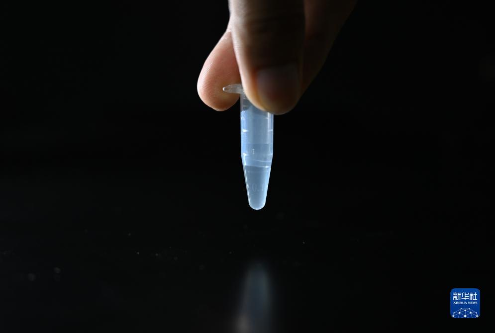 在中國科學(xué)院天津工業(yè)生物技術(shù)研究所實(shí)驗室拍攝的一份人工合成己糖溶液樣品(8月13日攝)。