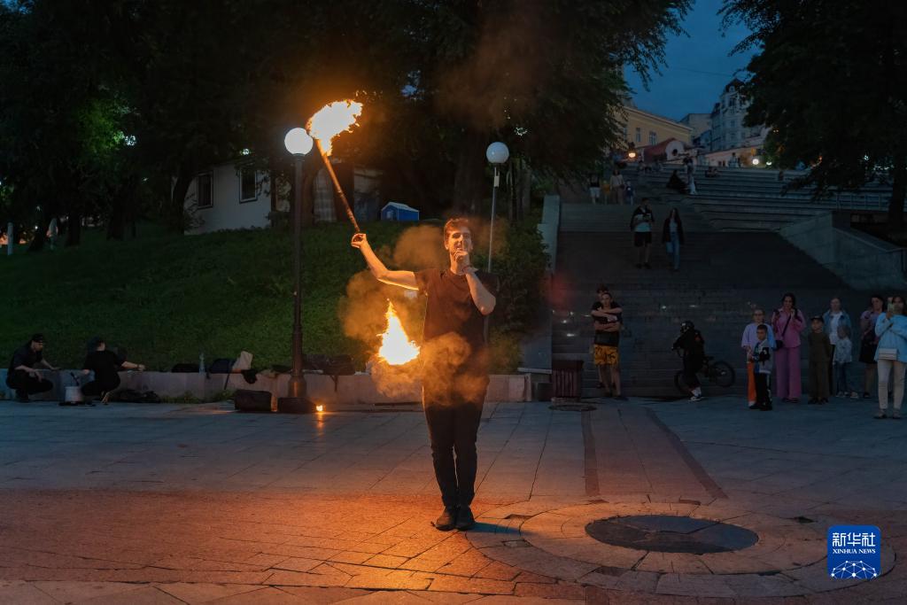 8月16日,一名男子在俄羅斯遠東城市符拉迪沃斯托克阿穆?tīng)枮车膹V場(chǎng)上表演火藝。