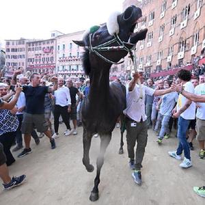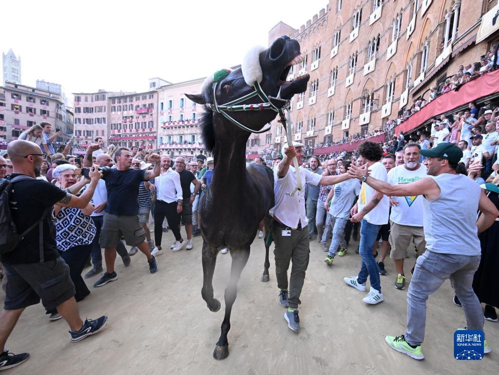 8月16日,在意大利錫耶納,人們聚集在獲勝馬匹周?chē)?/p>