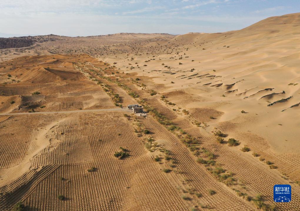 敦煌莫高窟崖體頂部戈壁帶和沙地上采用草方格、灌木植物固沙等綜合治沙措施保障石窟的防風(fēng)固沙安全。監測結果表明,經(jīng)過(guò)多年對流沙的持續治理,莫高窟受風(fēng)沙影響情況得到了有效控制(8月4日攝,無(wú)人機照片)。