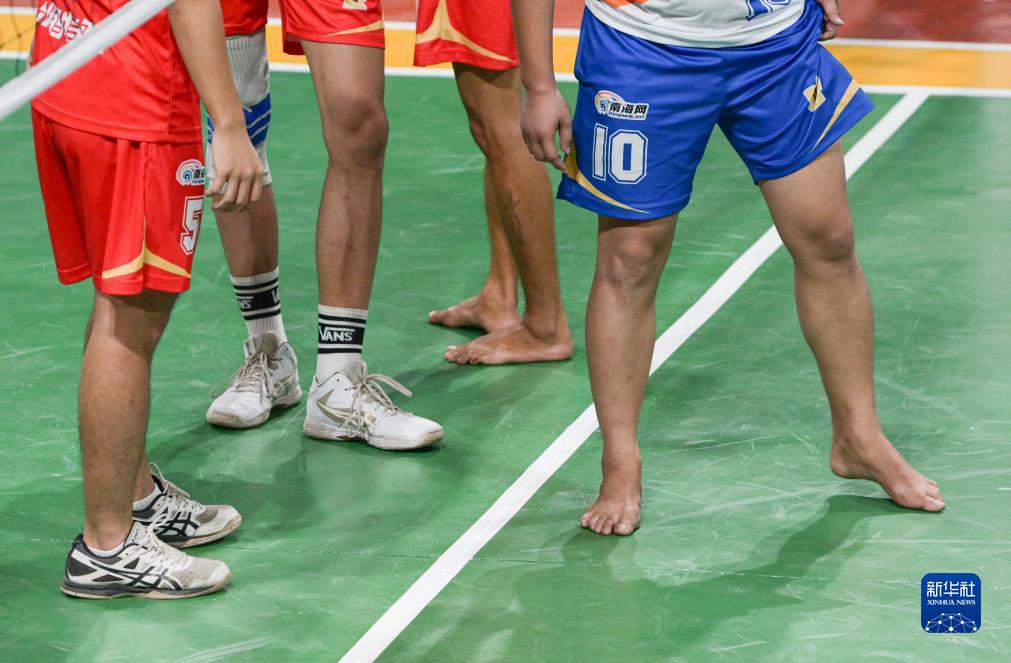 一場(chǎng)“村排”比賽中,部分隊員赤腳上場(chǎng)參賽(7月1日攝)。在文昌,很多人從小就習慣赤腳打排球。