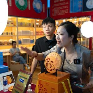 8月17日,一名主播在南亞茶葉節上通過(guò)直播售賣(mài)茶葉。