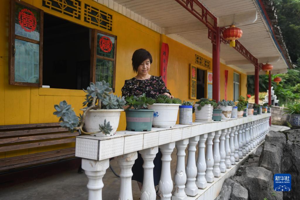 下坪鄉東洲村村民李雙銀在自家的“魯家大院”里整理花草(8月17日攝)。
