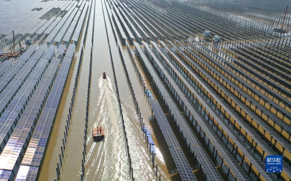 8月17日拍攝的三門(mén)灘涂光伏電站施工現場(chǎng)(無(wú)人機照片)。