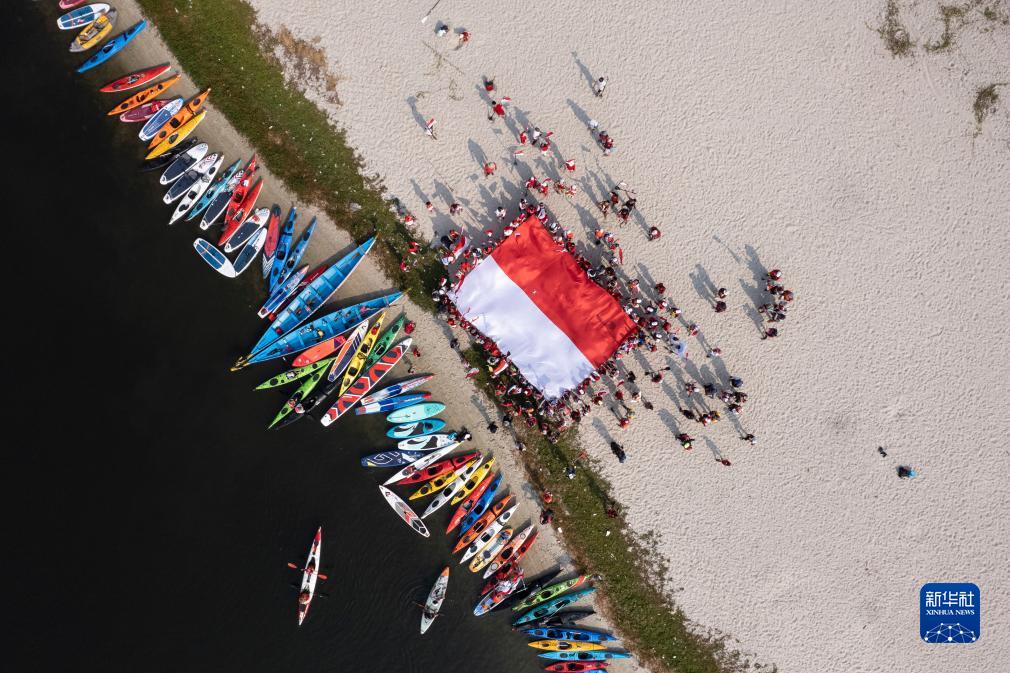 8月17日,在印度尼西亞雅加達安卒海灣,水上運動(dòng)愛(ài)好者展開(kāi)印尼國旗,慶祝獨立日(無(wú)人機照片)。
