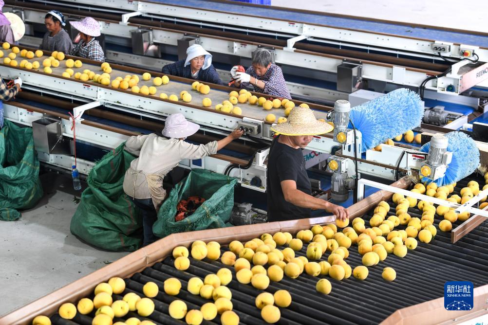 8月17日,村民在貴州省貴定縣德新鎮新鋪村黃桃種植基地的車(chē)間分揀黃桃。