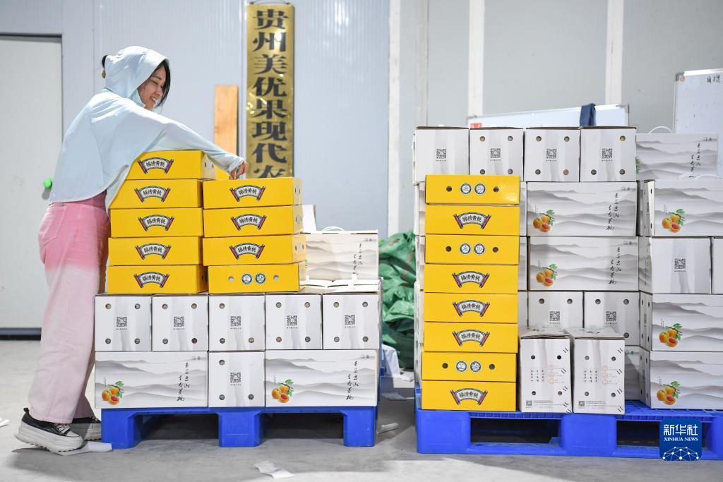 8月17日,工作人員在貴州省貴定縣德新鎮新鋪村黃桃種植基地的車(chē)間檢查黃桃包裝。