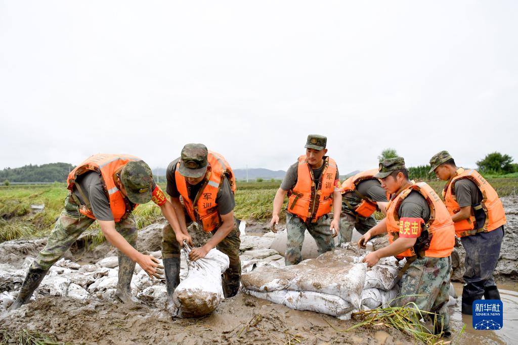 北部戰區陸軍某旅官兵在舒蘭市金馬鎮執行加固堤壩任務(wù)(8月13日攝)。