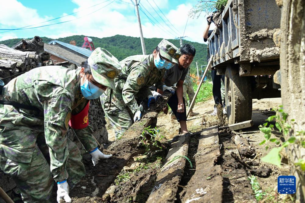 北部戰區陸軍某旅在牡丹江寧安市沙蘭鎮二呂村參與災后重建工作,黨員突擊隊幫助村民清理雜物(8月15日攝)。