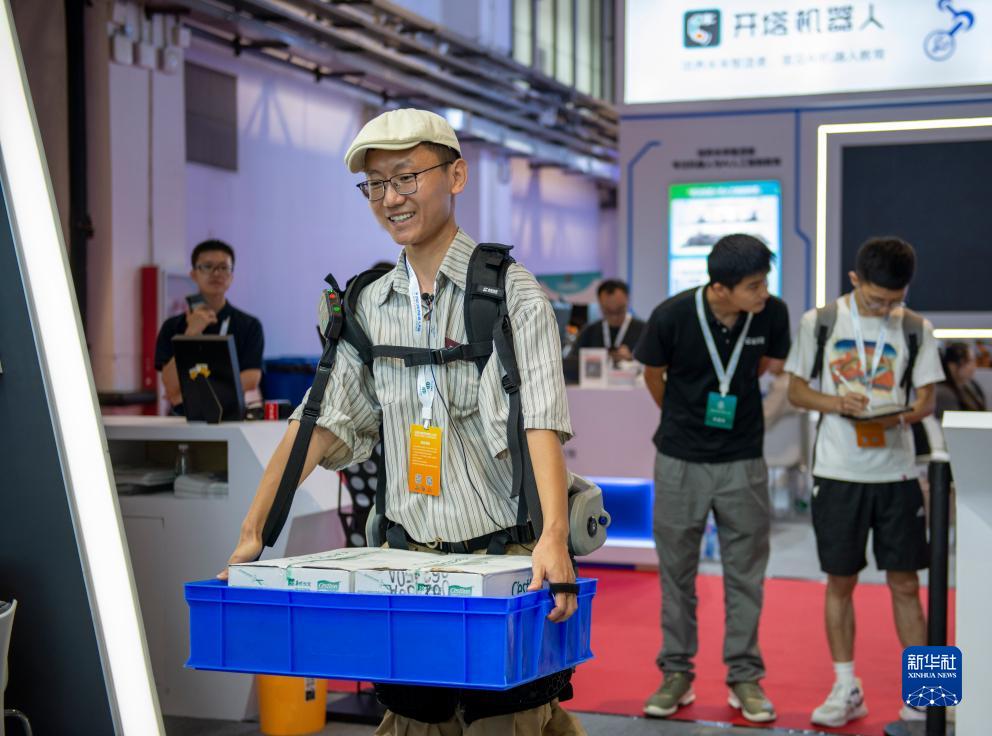 8月16日,在2023世界機器人大會(huì )現場(chǎng),體驗者穿戴腰部外骨骼機器人設備搬運重物。