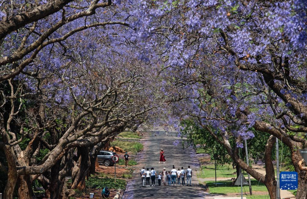 2020年10月17日,南非比勒陀利亞盛開(kāi)的藍花楹吸引游客前來(lái)拍照打卡。