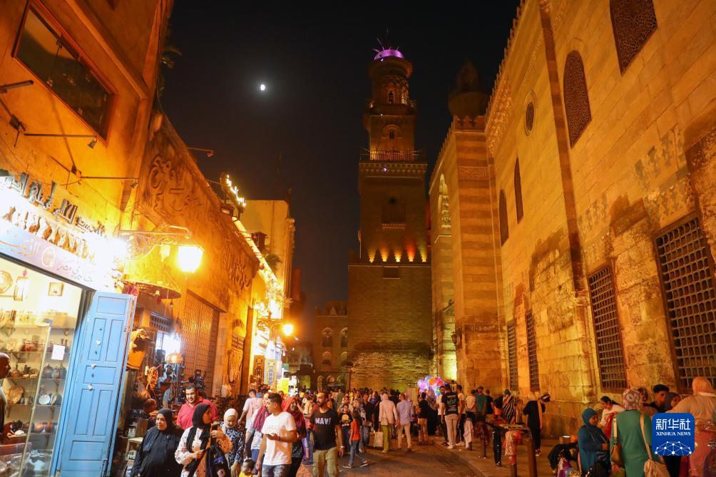 這是埃及開(kāi)羅哈里里市場(chǎng)夜市一角(7月28日攝)。