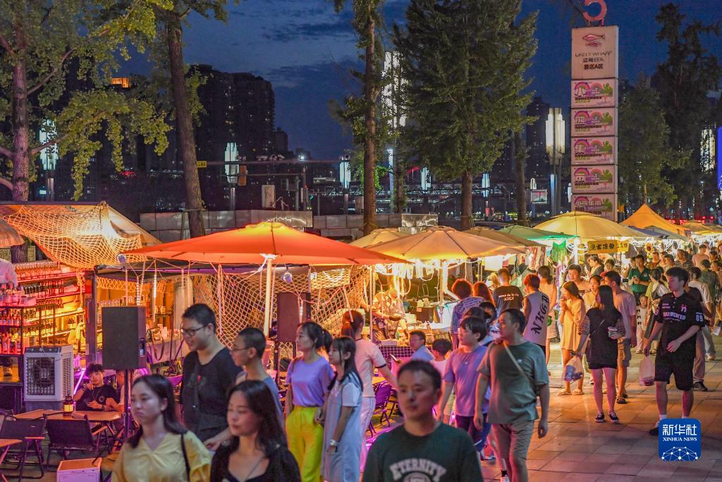 人們聚集在重慶市江北區鎏嘉碼頭的小熊集市(8月4日攝)。