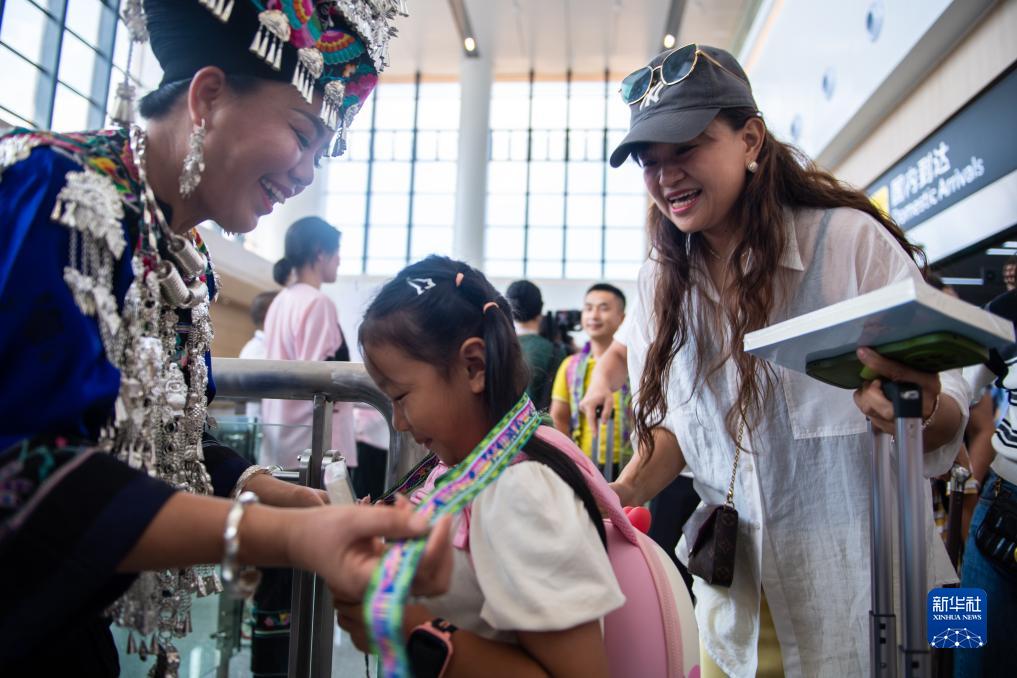 8月18日,當地群眾在湖南湘西邊城機場(chǎng)向抵達的旅客贈送花帶。