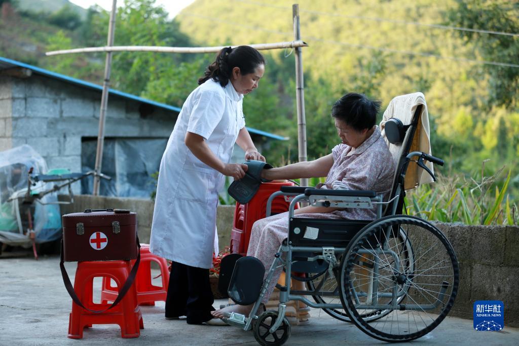 羅海香(左)為一名行動(dòng)不便的村民測量血壓(8月16日攝)。