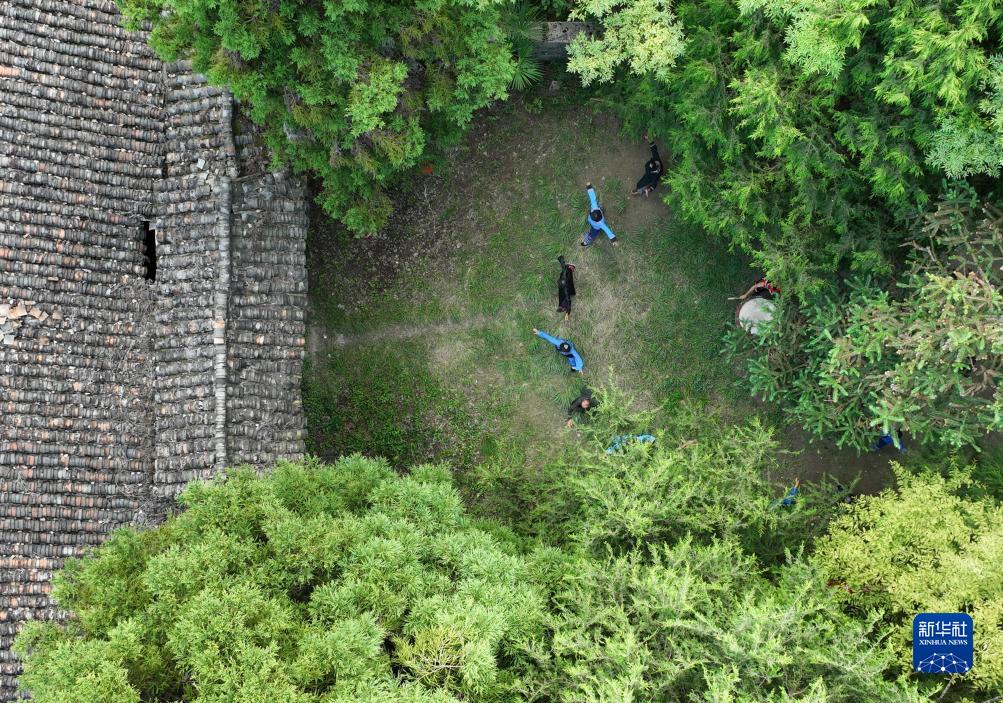 8月18日,舍米湖村村民在有著(zhù)數百年歷史的“擺手堂”前跳起擺手舞(無(wú)人機照片)。