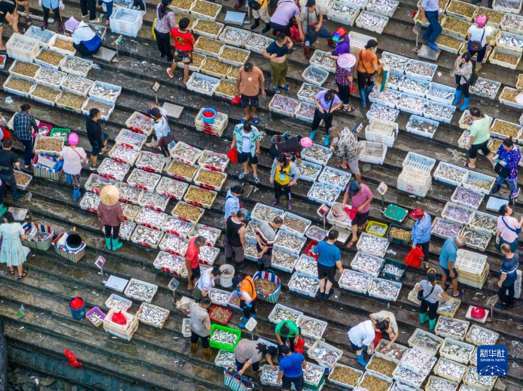 8月18日清晨,客商在北海電建漁港購買(mǎi)海鮮(無(wú)人機照片)。
