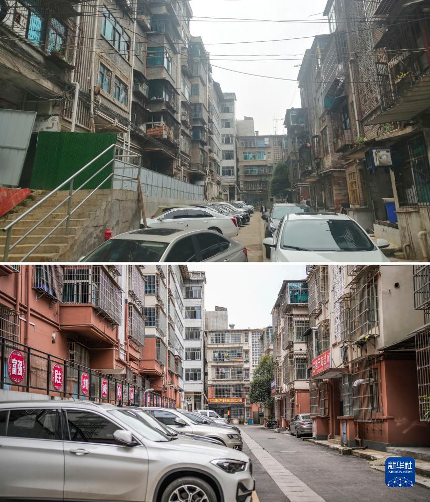拼版照片:上圖為改造前的六盤(pán)水市鐘山區黃土坡街道文明巷小區(資料照片);下圖為改造后的文明巷小區(8月17日新華社記者陶亮攝)。