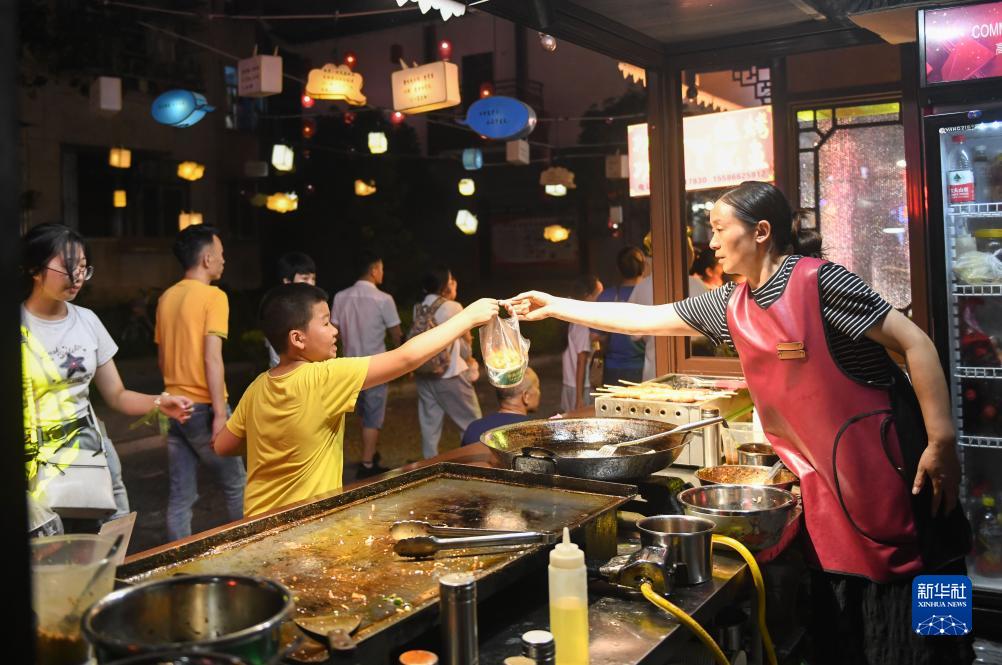 8月18日,小朋友在夜市上購買(mǎi)小吃。