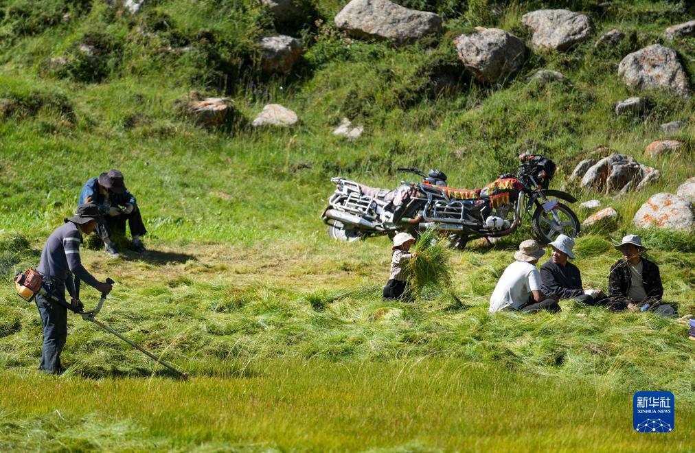 西藏自治區那曲市邊壩縣的農民在收獲牧草(8月17日攝)。