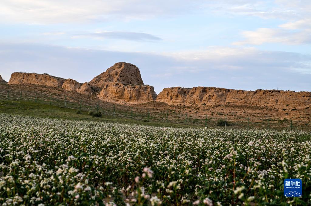鹽池縣一處長(cháng)城腳下蕎麥花開(kāi)放(8月18日攝)。