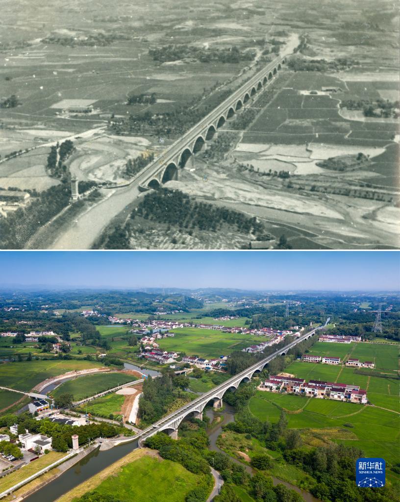 這是一張拼版照片。上圖為:1972年拍攝的位于安徽省六安市舒城縣的將軍山渡槽(新華社發(fā) 田準攝);下圖為:2023年8月15日拍攝的將軍山渡槽(無(wú)人機照片,新華社發(fā) 蔣常虹攝)。