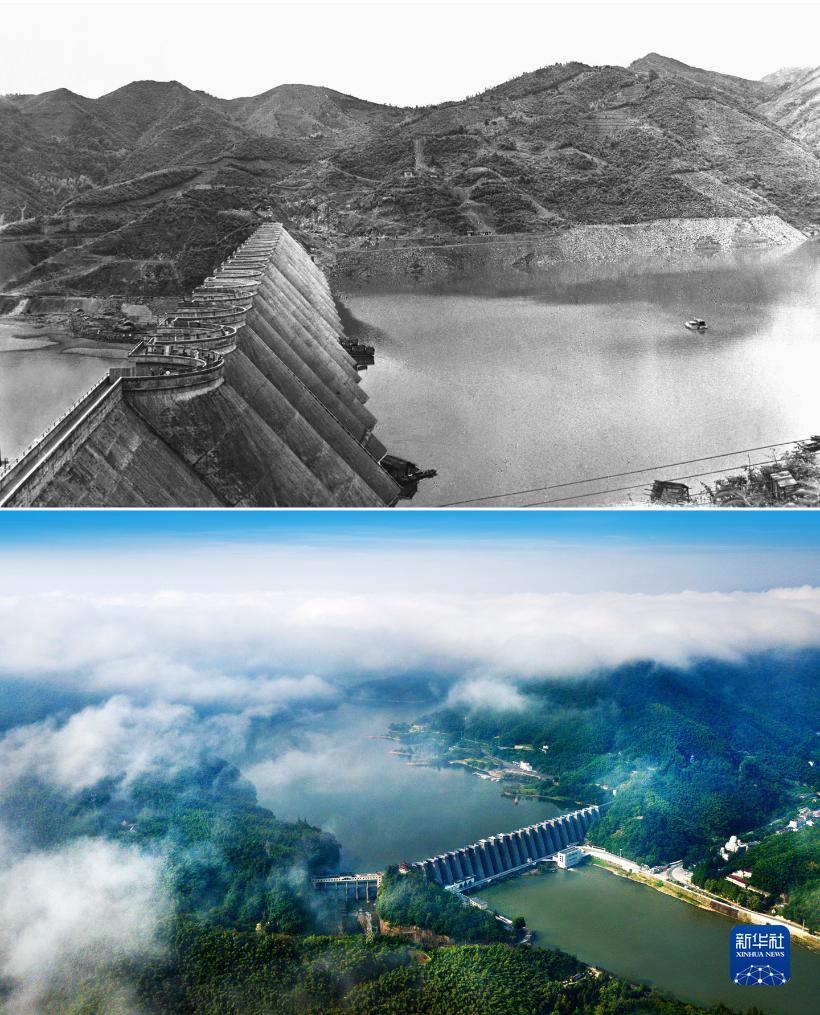 這是一張拼版照片。上圖為:拍攝的位于安徽省六安市金寨縣的佛子嶺水庫(資料照片,新華社發(fā) 樓并銓攝);下圖為:2021年8月8日拍攝的佛子嶺水庫(無(wú)人機照片,新華社發(fā) 蔣常虹攝)。