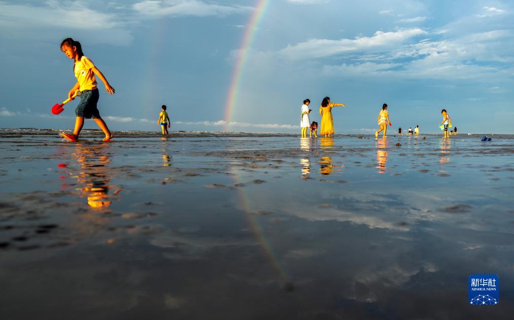 8月14日,游客在金灘出現的彩虹下游玩。