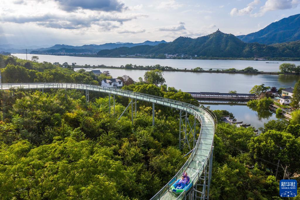 8月19日,游客在三都漁村體驗星空水滑道特色項目(無(wú)人機照片)。