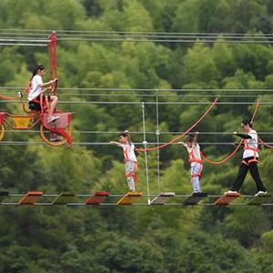 8月20日,游客在余姚市四明山鎮北溪村體驗高空項目。