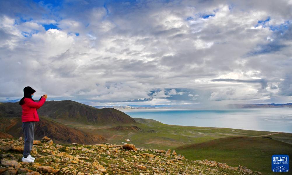 游客在扎日南木錯湖畔拍攝(8月19日攝)。