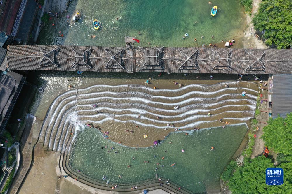 游客在融水苗族自治縣香粉鄉雨卜村戲水消暑(8月19日攝,無(wú)人機照片)。近年來(lái),雨卜村充分利用粵桂協(xié)作幫扶資金,通過(guò)整治河道、修繕古建筑等,發(fā)展鄉村旅游產(chǎn)業(yè),打造鄉村旅游示范村。