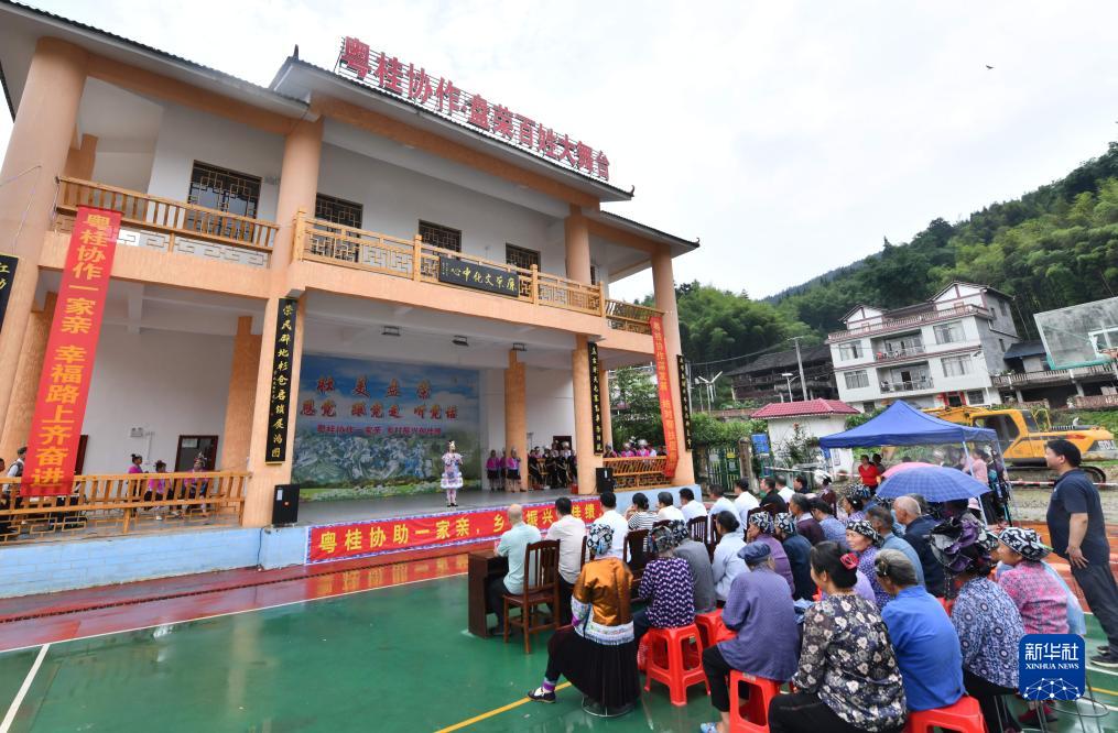 融水苗族自治縣懷寶鎮盤(pán)榮村村民在新建的粵桂協(xié)作文化戲臺前觀(guān)看演出(5月26日攝)。近年來(lái),融水縣投入粵桂協(xié)作幫扶資金,建成盤(pán)榮村百姓大舞臺、農特產(chǎn)品展示中心等設施,打造產(chǎn)業(yè)融合發(fā)展示范村。