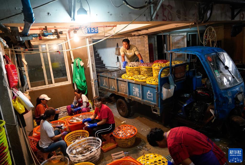 8月17日,工作人員將剛到港的梭子蟹轉運至浙江省舟山市普陀區舟山國際水產(chǎn)城商戶(hù)的暫養池。新華社記者 韓傳號 攝
