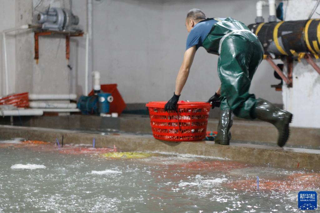8月16日,工作人員將剛到港的梭子蟹轉運至浙江省舟山市普陀區舟山國際水產(chǎn)城商戶(hù)的暫養池。新華社記者 劉夢(mèng)琪 攝