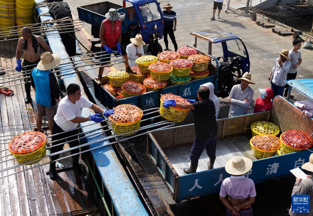 8月16日,在浙江省舟山市普陀區舟山國際水產(chǎn)城碼頭,工作人員從漁運船上卸下新鮮梭子蟹。新華社記者 韓傳號 攝