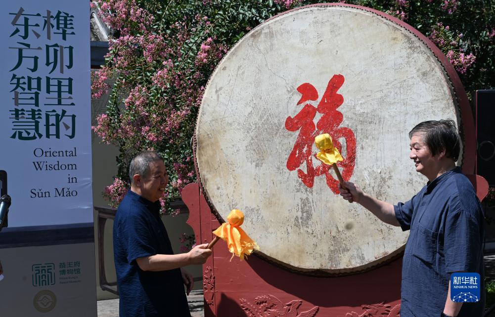 8月21日,京作硬木家具制作技藝國家級代表性傳承人種桂友(左)、明式家具制作技藝國家級代表性傳承人許建平共同為展覽擊鼓開(kāi)幕。