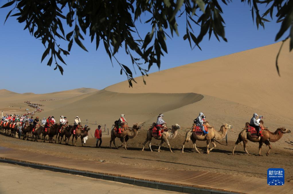 8月20日,游客在甘肅省敦煌市鳴沙山月牙泉景區游覽。