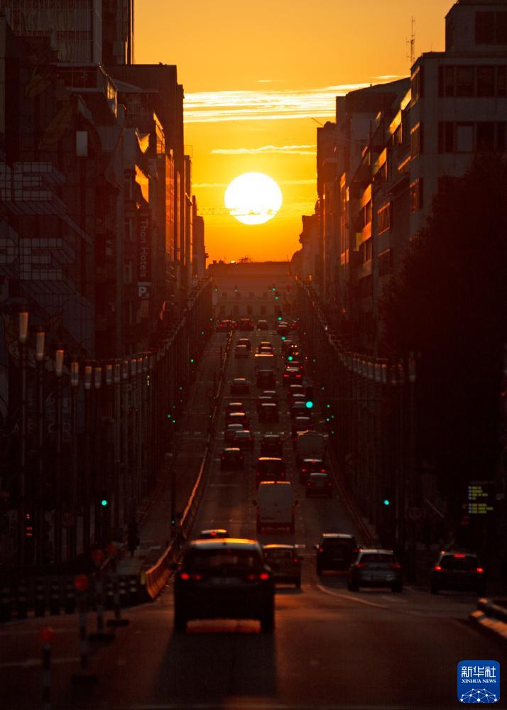 當日,在比利時(shí)首都布魯塞爾,夕陽(yáng)從主干道法律大街上空緩緩落下,形成“懸日”景觀(guān)。