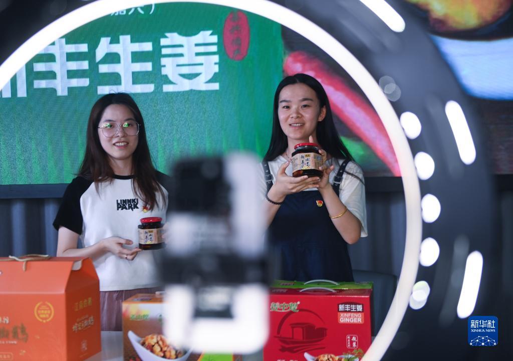 8月22日,黨員志愿者在嘉興市南湖區電商產(chǎn)業(yè)園的共富工坊直播間進(jìn)行生姜助農直播銷(xiāo)售。