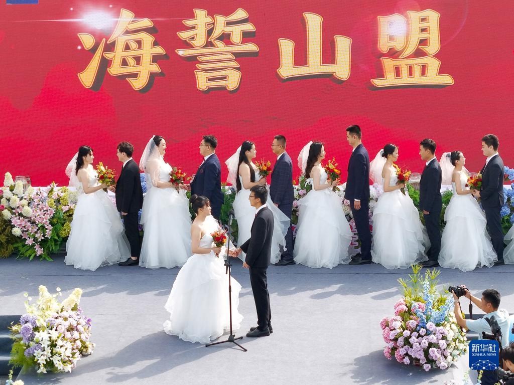 8月22日,新人們在山東青島金沙灘啤酒城“愛(ài)情海灣”參加集體婚禮(無(wú)人機照片)。