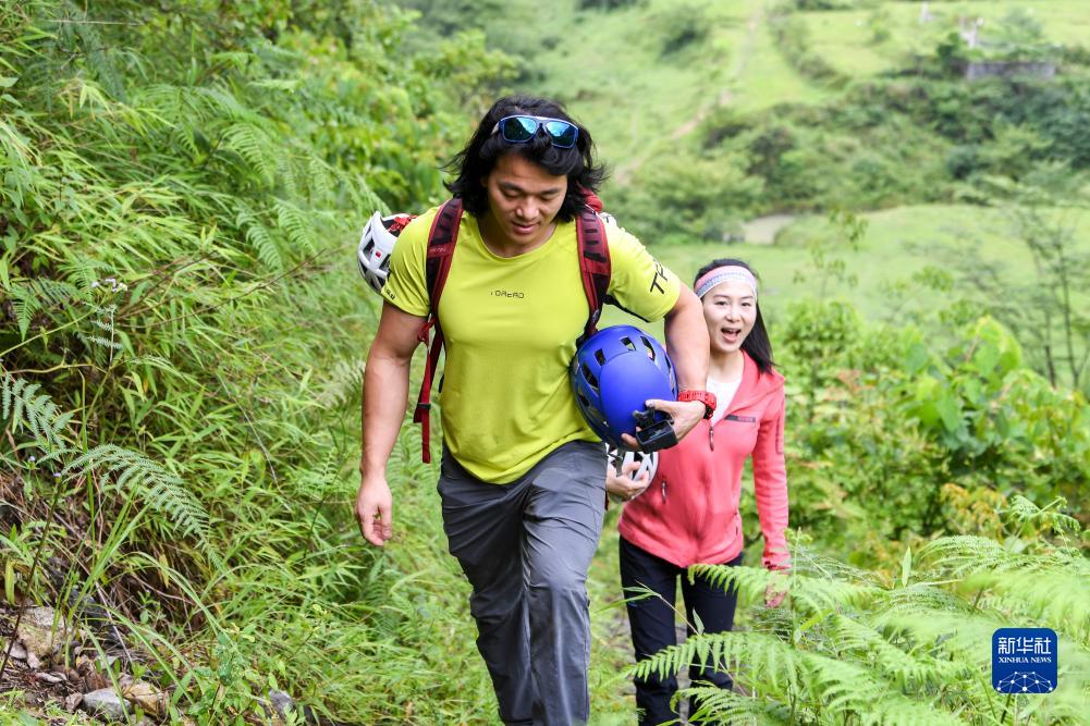 劉永邦(左)和肖婷在查看攀巖線(xiàn)路(2021年6月26日攝)。