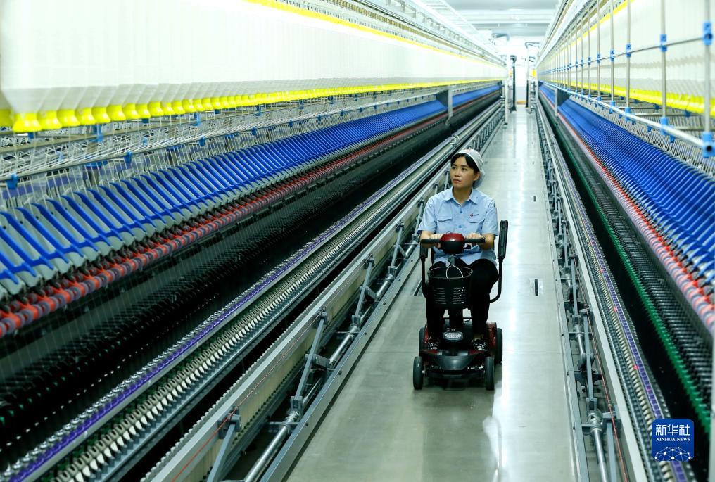 8月22日,青島即發(fā)盛寶紡織有限公司工人在數字化紡紗智能生產(chǎn)線(xiàn)上生產(chǎn)高端纖維。